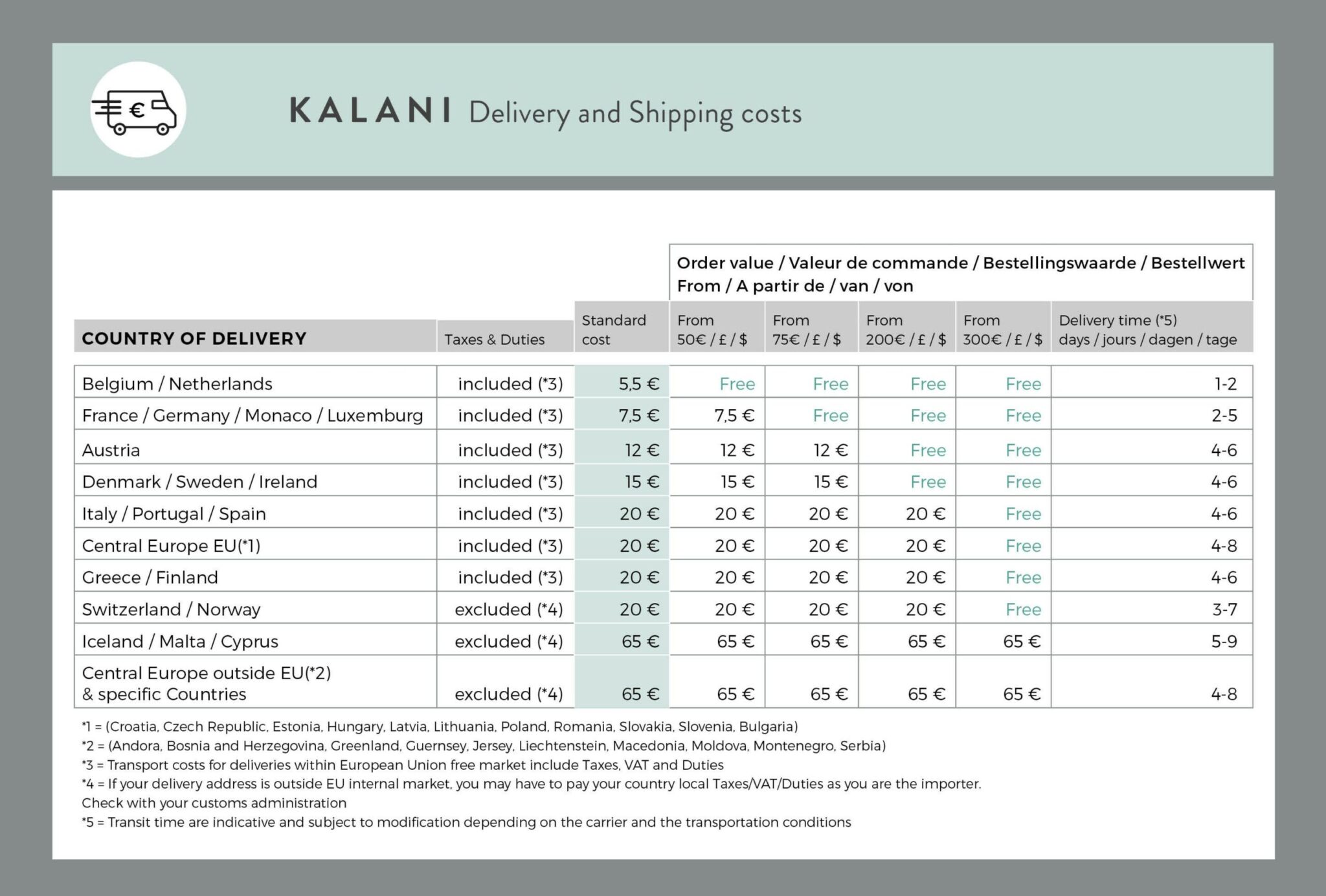 BREXIT situation and deliveries to the UK: as of January 1st 2021, the rules for deliveries from Europe to the UK change. Specifically, customers who are delivered to the UK will pay excluding VAT for their order of KALANI products on our online shop, and taxes will be payable to the carrier who will take care of clearing customs for your products on arrival in the UK. The table below still needs to be modified, but the United Kingdom (UK) joins the group of countries Switzerland/Norway/United Kingdom and the delivery costs therefore increase to 20€ for orders under 300€.