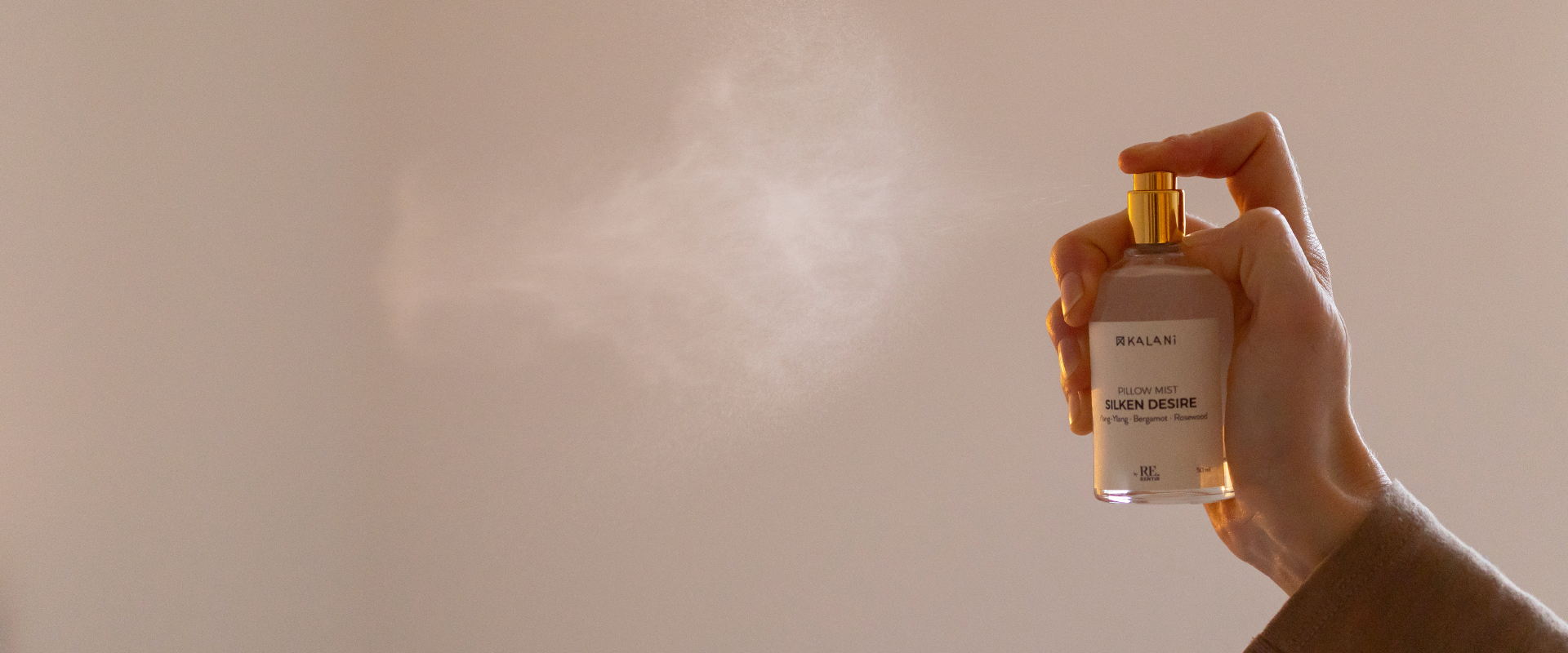 Eén tot drie verstuivingen van pillow mist, aangebracht op ongeveer 50 cm afstand, volstaan om deze olfactorische sfeer te creëren. De mist verdampt grotendeels tijdens de nacht, maar de ervaring en ambiance blijven gegarandeerd tot het moment van inslapen.